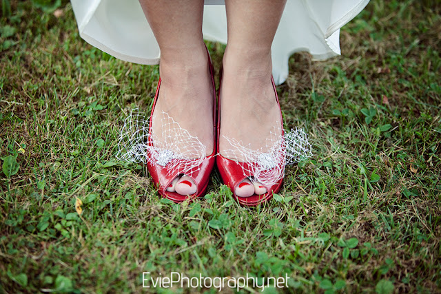 Again, easy vintage clip on earrings with birdcage tulle makes every day red pumps look amazing!